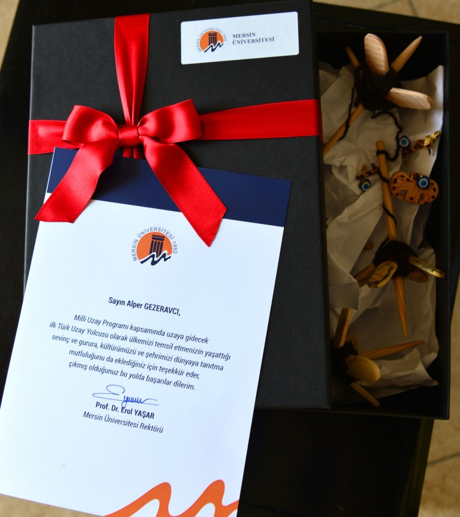 Rektörümüz Prof. Dr. Erol Yaşar’ın “Milli Uzay Programı kapsamında uzaya gidecek ilk Türk Uzay Yolcusu olarak ülkemizi temsil etmenizin yaşattığı sevinç ve gurura, kültürümüzü ve şehrimizi dünyaya tanıtma mutluluğunu da eklediğiniz için teşekkür eder, çıkmış olduğunuz bu yolda başarılar dilerim.” notunun da içerisinde yer aldığı kutu Alper Gezeravcı’ya iletildi ve gerekli izinlerin ardından nesneler uzaya gönderilerek uzaya Mersin Üniversitesi'ne ait bir imza atılmış oldu.
