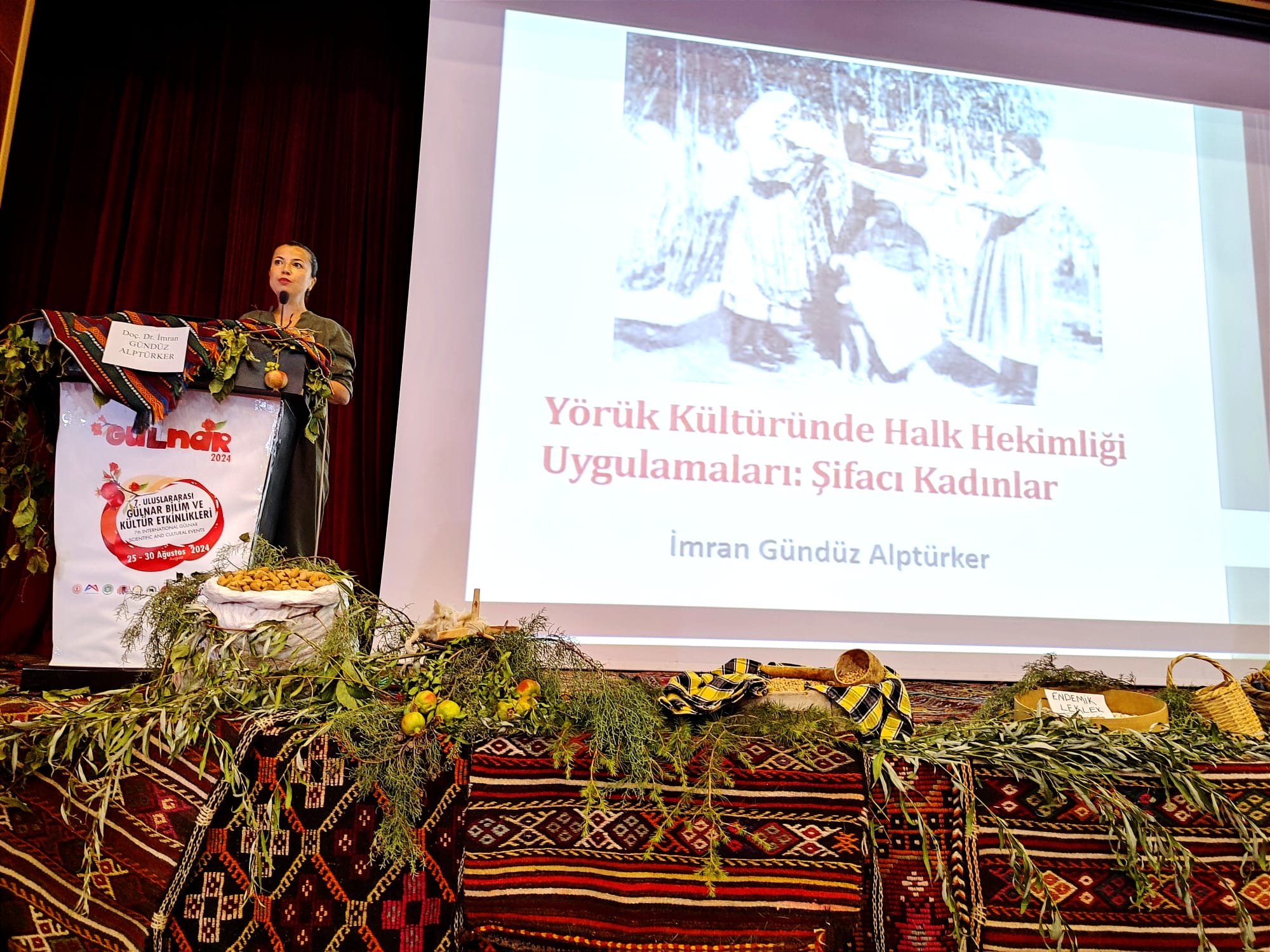 Yörük Kültürü Uygulama ve Araştırma Merkezi Müdürü Doç. Dr. İmran Gündüz Alptürker, gerçekleştirdiği “Yörük Kültüründe Halk Hekimliği Uygulamaları: Şifacı Kadınlar” başlıklı sunumunda Yörüklerin geleneksel yaşam tarzlarını korumalarında ve kültürel birikimlerini aktarmada kadınların rolünün oldukça önemli olduğunu vurguladı. İyi bir gözlemci, iyi bir dokumacı, iyi bir süt ve süt ürünleri uzmanı, iyi bir veteriner, iyi bir bitki bilimi uzmanı gibi pek çok açıdan donanımlı olan Yörük kadınının şifacı kimliği üzerinden kültürü mayalayan kişi olarak kültürün kuşaktan kuşağa aktarımına sağladığı katkıya değindi. Kadınların, şifacı kimlikleriyle, somut olmayan kültürel mirasın tanımlanması sırasında oluşturulan beş alandan biri olan “doğa ve evrenle ilgili bilgi ve uygulamalar” başlığı altında yer alan geleneksel halk tıbbı ile ilgili uygulamalar bağlamında kültürün sürdürülebilirliğine olan katkıları hakkında bilgi aktardı.