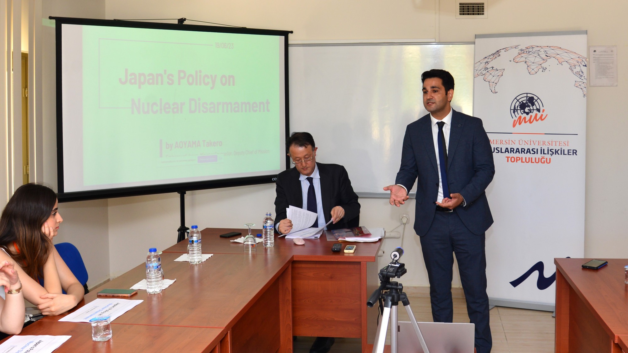 Etkinlikte, Takero Aoyama Japonya’nın nükleer silahsızlanma politikası ile ilgili bir konuşma gerçekleştirdi. Takero Aoyama sunumu sırasında, uluslararası barışı tehdit ettiğini düşündüğü gelişmeler üzerinde durdu ve Japonya’nın, tarihinde atom bombasının yıkımını yaşamış tek ülke olarak, uluslararası barışı destekleyen stratejilerinden söz etti. Barışın korunmasına nükleer silahsızlanma yönünden odaklanan Aoyama, Japonya’nın nükleer enerjinin barışçıl amaçlarla kullanılmasını savunduğunu, nükleer silah sahibi ülkelerin şeffaf olmasını desteklediğini paylaştı.