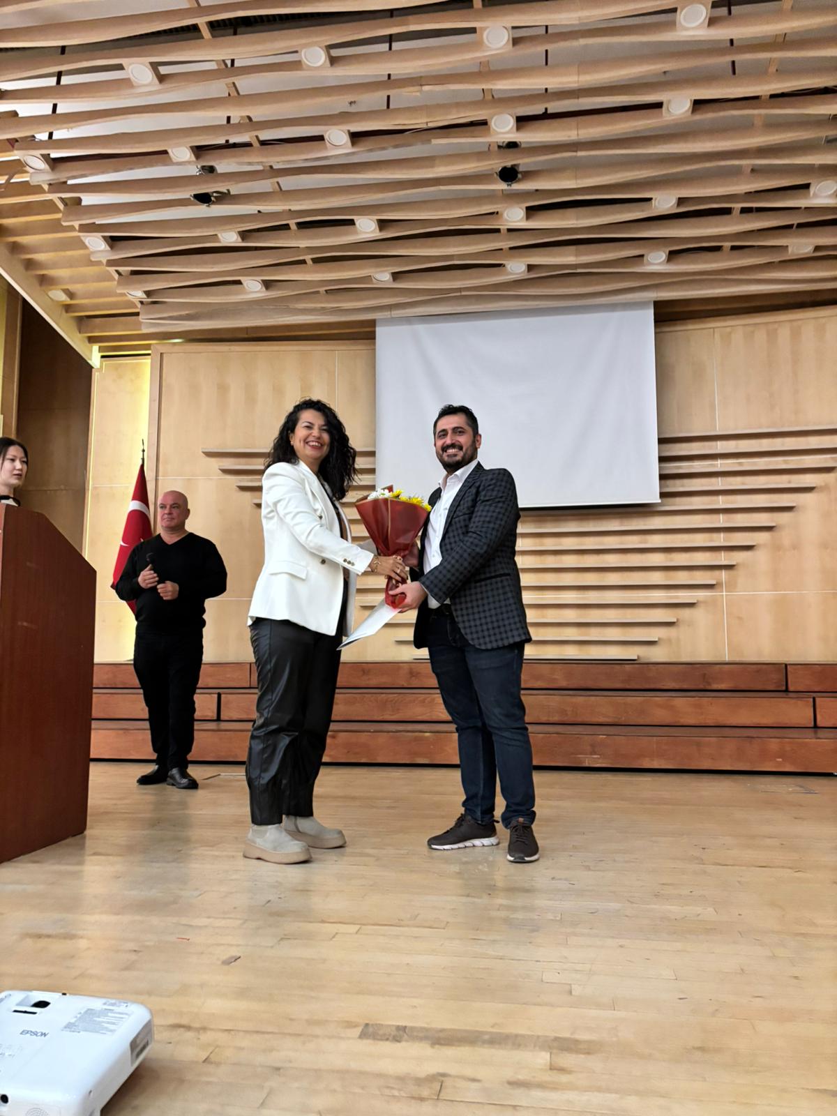 Sunumun ardından Mersin Üniversitesi TUAM VE YÖRMER Müdürü Doç. Dr. İmran Gündüz Alptürker tarafından kurumlar adına konferansa katılımı ve katkıları dolayısıyla Dr. Öğr. Üyesi Bilal Özel’e teşekkür belgesi ve çiçek takdim edildi.