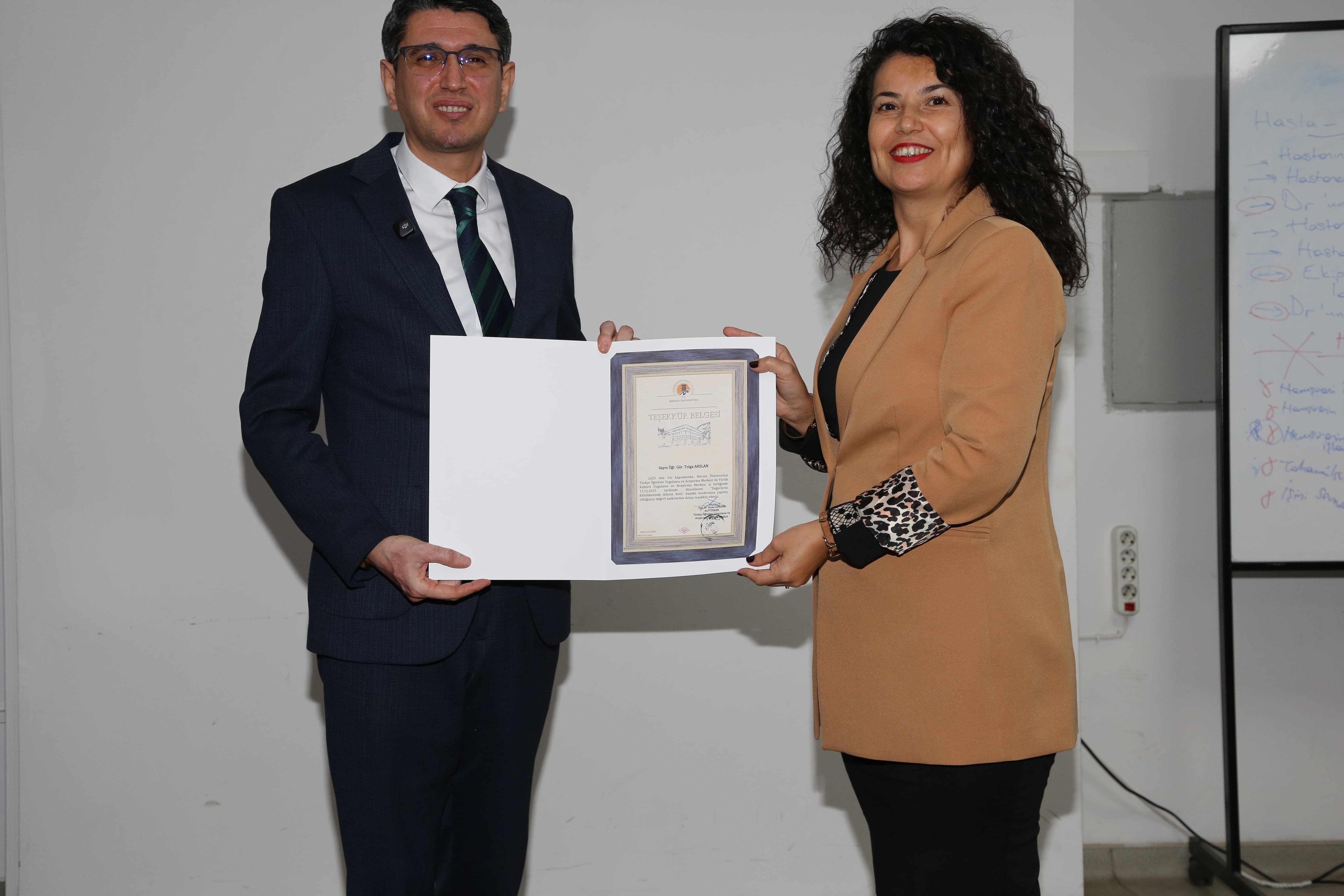 Konferansın sonunda, Merkezlere sunduğu katkılardan dolayı Öğr. Gör. Tolga Arslan’a teşekkür belgesi, TUAM ve YÖRMER Merkez Müdürü Doç. Dr. İmran Gündüz Alptürker tarafından takdim edildi. Fotoğraf çekiminin ardından program sona erdi.  @meukurumsal @mersintuam @yormer.meu.yorukkulturu #konferans #aile yılı