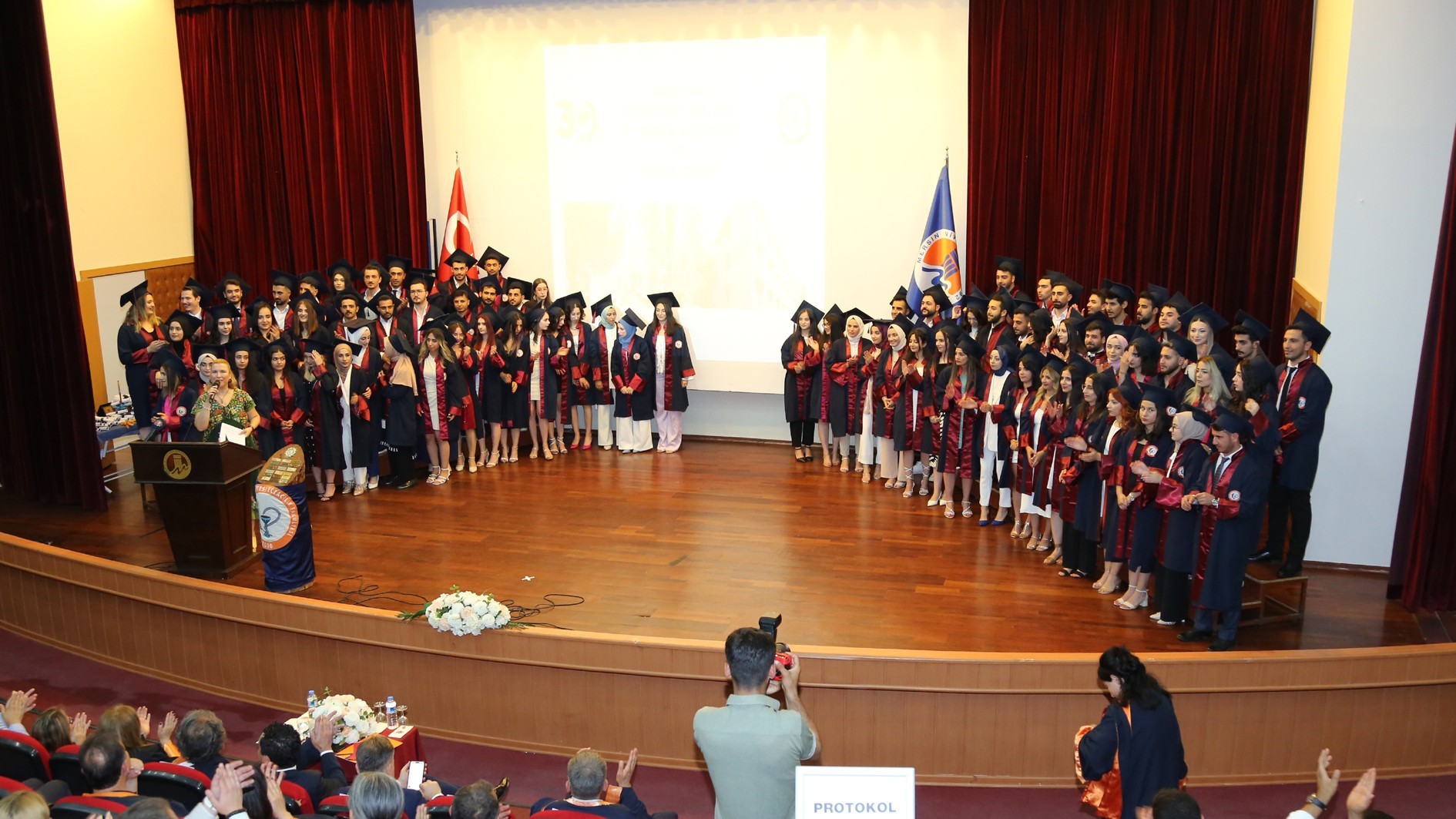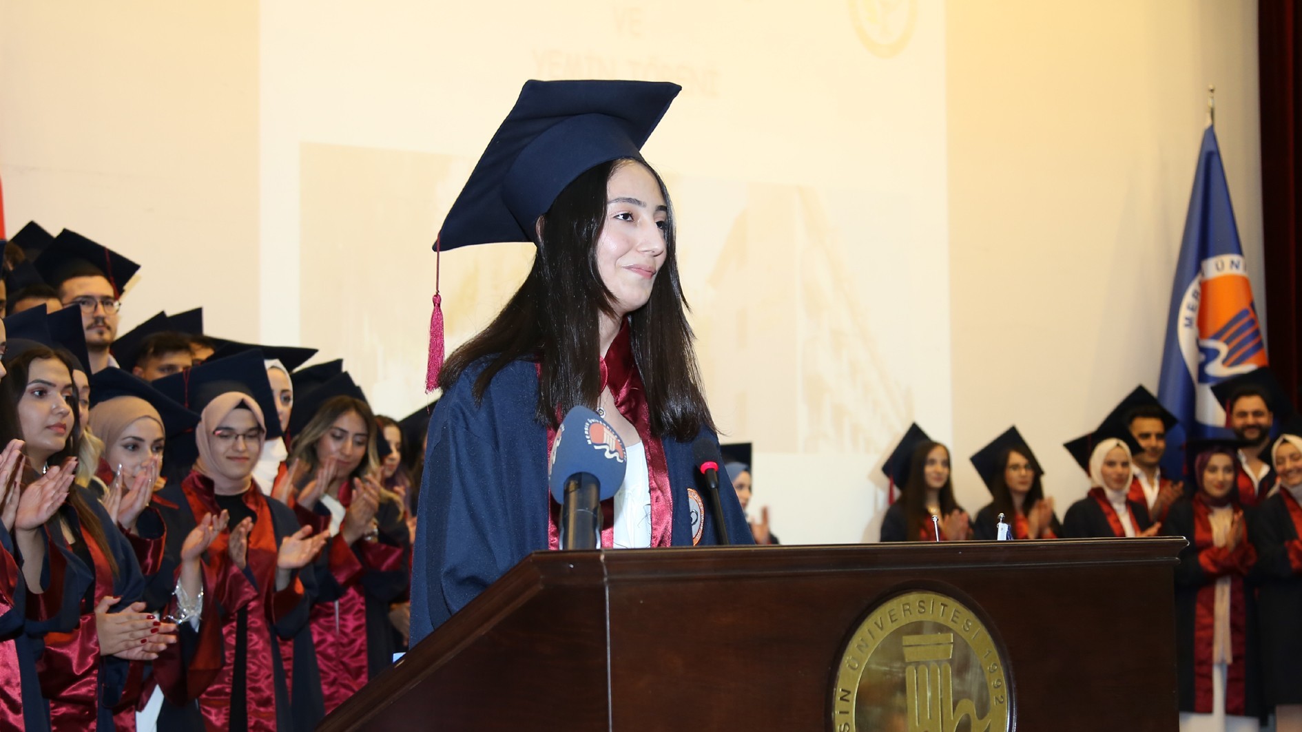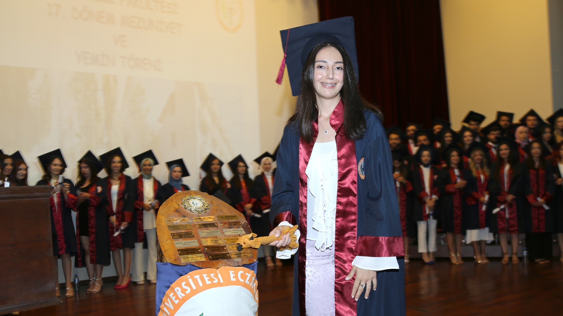 Mezunlar adına konuşan fakülte birincisi Ecz. Seda Nur HORTOĞLU ise eczacılık mesleğinin kısa süre içerisinde en büyük tutkusu haline geldiğini ifade etti. HORTOĞLU, “Bizler, hastalığın mekanizmasına yönelik etkili, bitkisel hayvansal veya sentetik kaynaklı kimyasalları kullanarak en uygun formda ilaçları hazırlayan ve hastaya ulaştıran sağlık profesyonelleriyiz. Hastaların en yakın ve ilk sağlık danışmanlarıyız. Bizlerin bu noktaya gelmesinde büyük emekleri olan ailelerimize ve kendi ışıklarından bizlere ışık vermekten kaçınmayan, öğrencisine dokunan tüm değerli hocalarıma teker teker teşekkür ediyorum. Bir şifacı olarak bilimin ışığında her zaman en iyisini yapacağıma söz veriyorum.” dedi.