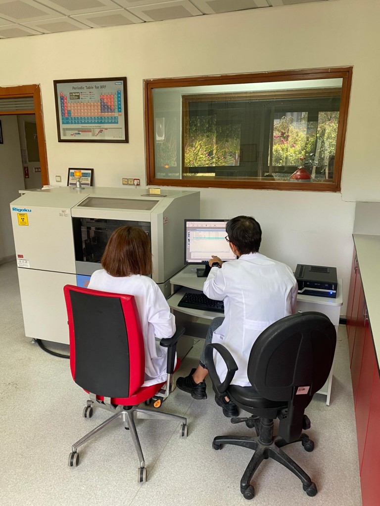 X-Işını Floresan (XRF) spektroskopisi cihazı ile inorganik katı ve sıvı malzemelerin Be-U arası tüm elementel, oksit ve özel bileşik olarak kimyasal analizi yapılmaktadır. Cihazın üstten ışımalı özelliğinden ve içerisinde bulunan 10 ayrı kristalden dolayı hafif elementler kolay ve net bir şekilde tespit edilmektedir. Numune için standartlar elde edilemediğinde, yarı kantitatif analiz programı (SQX) kullanılmaktadır. XRF cihazı ile malzemelerin kalitatif, yarı kantitatif ve standart numuneleri olması koşuluyla tam kantitatif analizleri yapılmaktadır.
