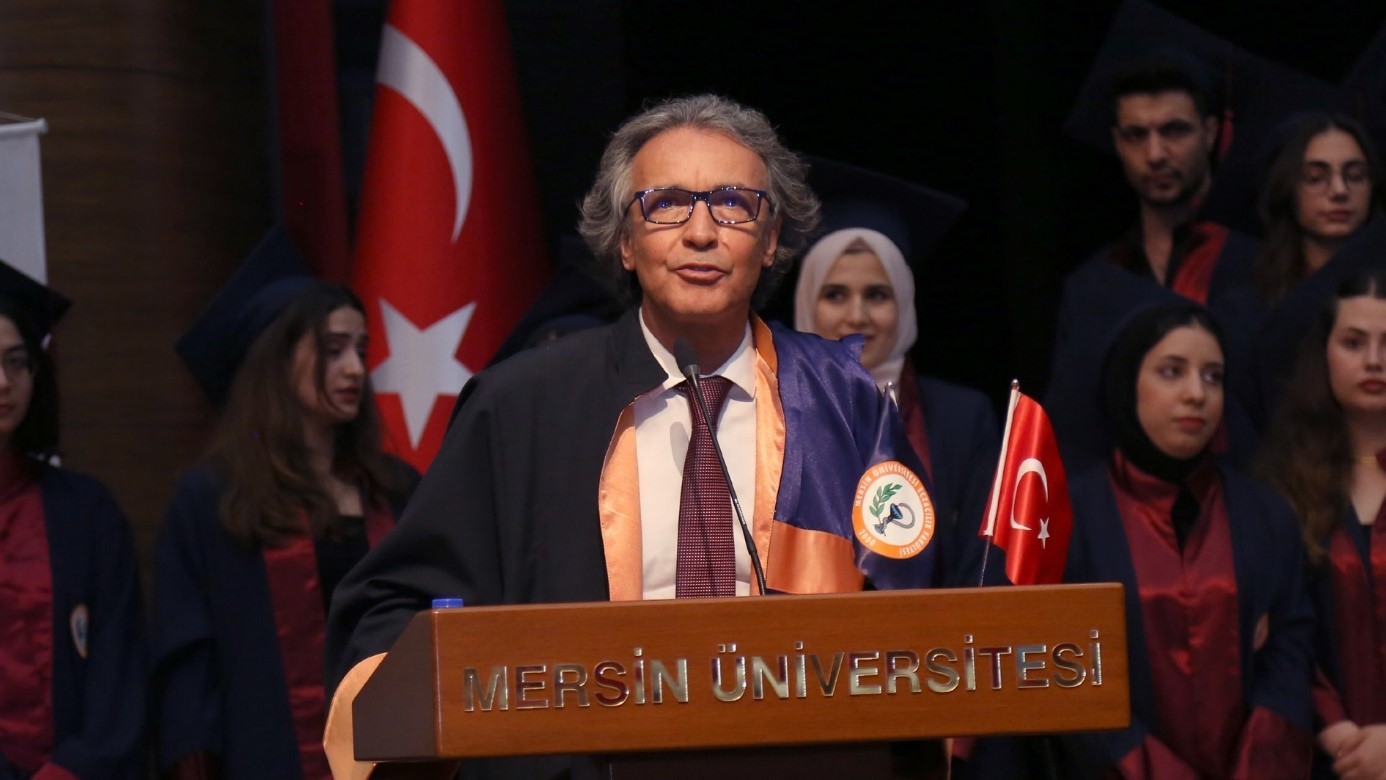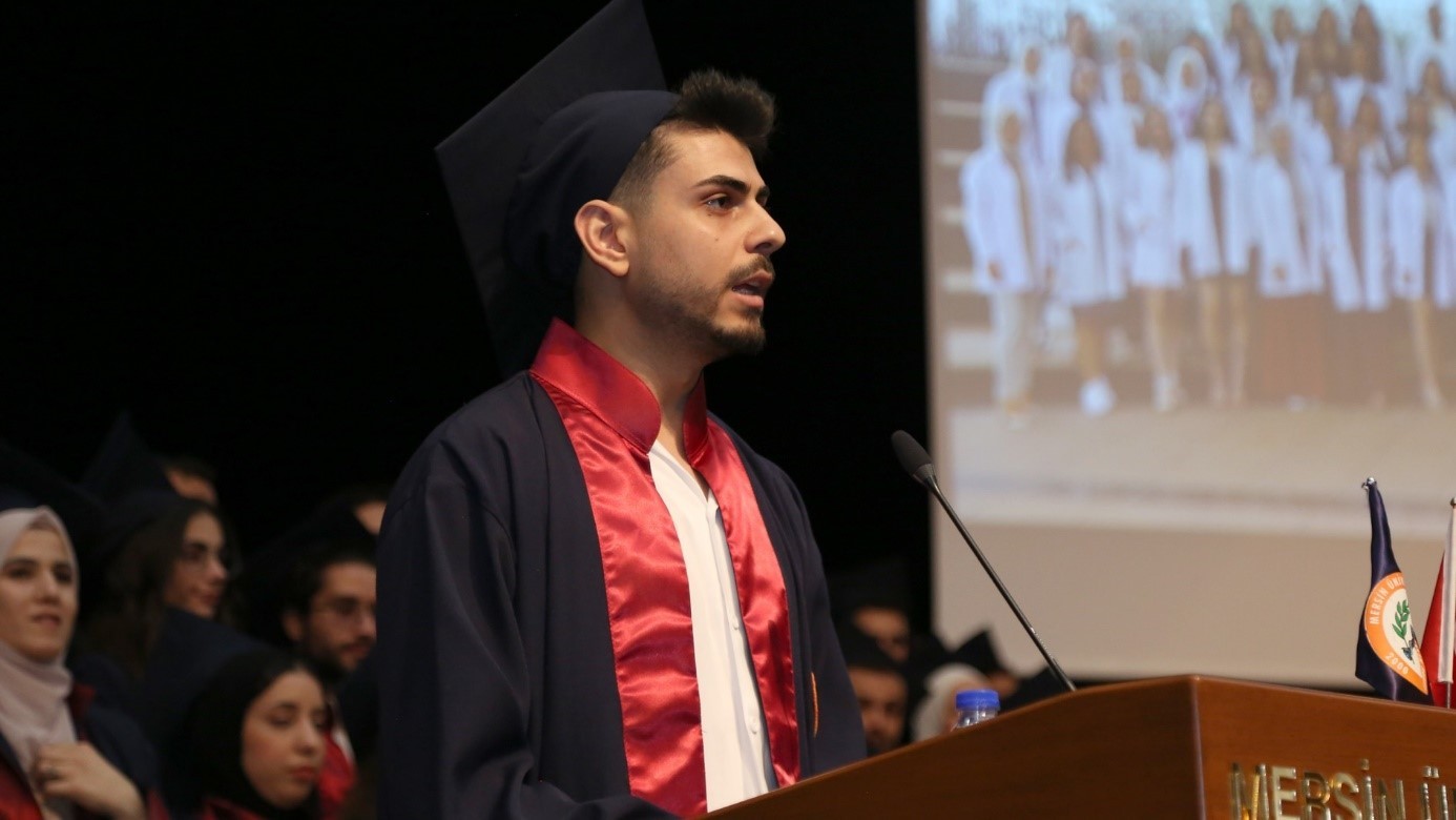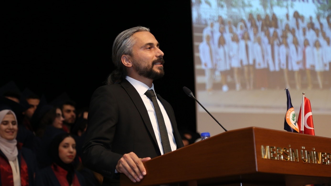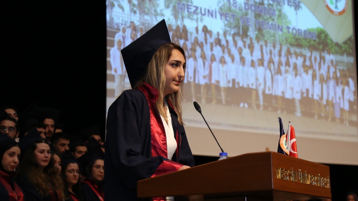 Mersin Eczacı Odası Genel Sekreteri Sayın Ecz. Oktay ASLAN, “Bugün edeceğiniz yemin sonrası meslektaşlarınız olarak aramıza katılacaksınız.  Sizlerle özellikle staj döneminde ve 5. sınıf staj eğitimlerinizde ne yapacağınız ile ilgili çok fazla konuşmuştuk. Fakültemizin akreditasyon sürecine destek veriyoruz ve birlikte omuz omuza yürüyoruz. Kendilerine bu konuda her türlü desteğimizi sunuyoruz. Önümüzdeki süreçte de tekrar akreditasyon alacağımızdan şüpheniz yok. Bu kapsam da gerçekleştirmiş olduğumuz simülasyon eczanesini de en kısa sürede tekrar tamamlayacağız. Bunun sözünü de veriyoruz. Bizler oda olarak fakülteden mezun olan tüm meslektaşlarımıza yardım için uzun yıllardır çaba göstermekteyiz. Mersin’de kalan meslektaşlarımızla mezuniyetleriniz sonrası bayram dönüşü bir eğitim, bilgilendirme ve tanışma toplantısı yapacağız. Unutmayalım ki odalar, meslektaşlarımızın yani bizlerin gücü. Aramıza katılan siz değerli meslektaşlarımızla gücümüzü artırarak problemlerimizi hızlı çözebileceğimize inanıyor, meslek hayatınızda hepinize başarılar diliyorum” ifadelerini kullandı.