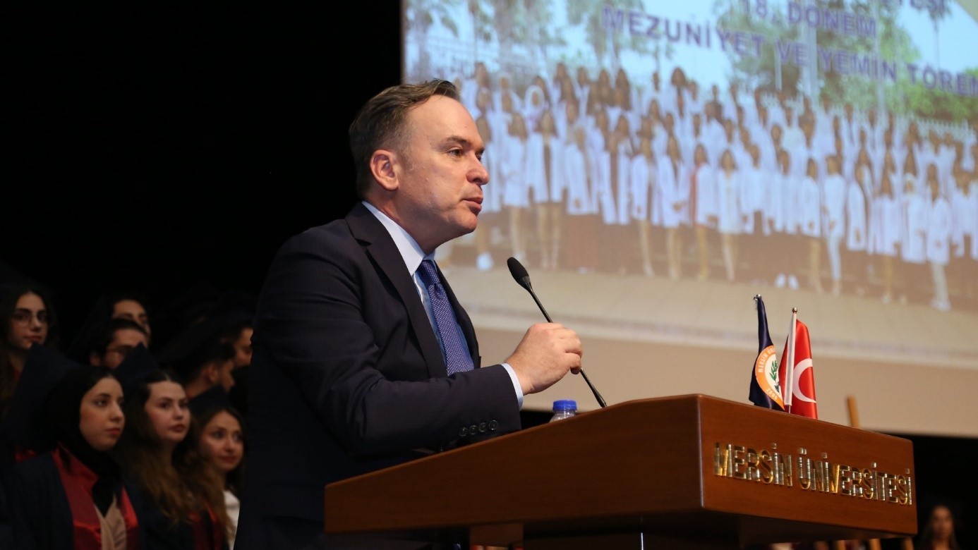 Özellikle velilerin gurur duyacağı bir gün yaşadıklarını belirterek konuşmasına başlayan Rektör Yardımcımız Prof. Dr. Ahmet Hakan ÖZTÜRK, “Biz de bu duygunuza eşlik ediyoruz ve katılıyoruz. Sizler kadar olmasa da aynı gururu bizler de duyuyoruz. Çünkü bu haklı gururu en çok duyacak kişiler sizlersiniz. Onları iyi bir şekilde yetişirdiniz. Bir meslek sahibi oldular. Bugün itibariyle mezun oluyorlar ve ant içecekler. Bu mesleği en iyi şekilde yapmak için etik değerlere bağlı olarak, yaşam boyu öğrenme felsefesiyle insanlığa hizmet etmek üzere hiçbir ayrım yapmadan bütün değerlere sahip olarak yetiştiler. Vatana, millete, topluma, insanlığa en iyi şekilde hizmet edeceklerinden ben eminim. Burada en büyük teşekkür bence velilere. Çünkü çok özveride bulundular.” dedi.