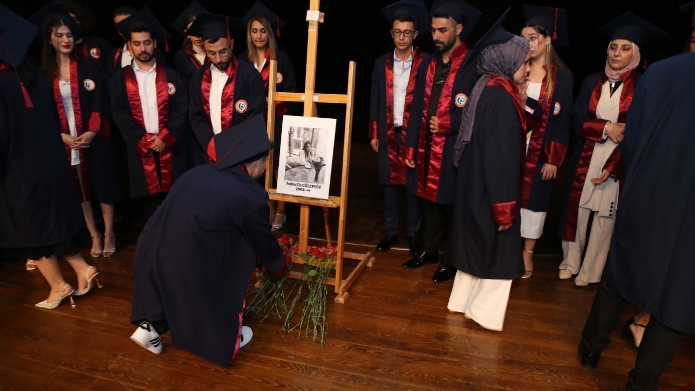 Öğrencilerimizin salondaki yerlerini almasının ardından 6 Şubat depremlerinde hayatını kaybeden Fakültemiz öğrencisi Fedva Ela GÜLERYÜZ için arkadaşlarının hazırladığı video izletildi ve daha sonrasında öğrencimizin fotoğrafının bulunduğu şövalenin önüne karanfiller bırakıldı.