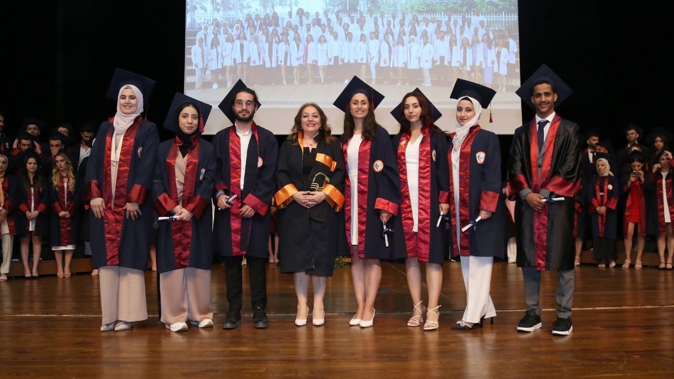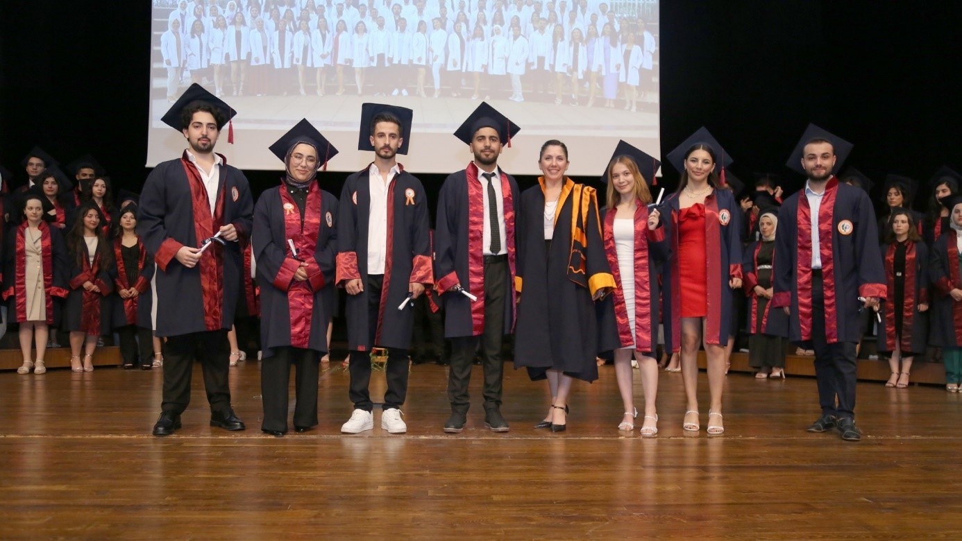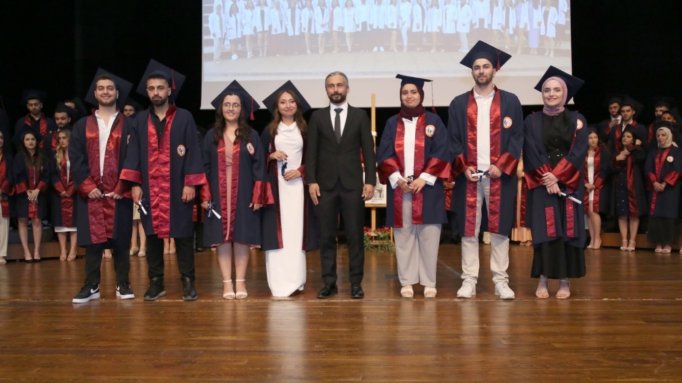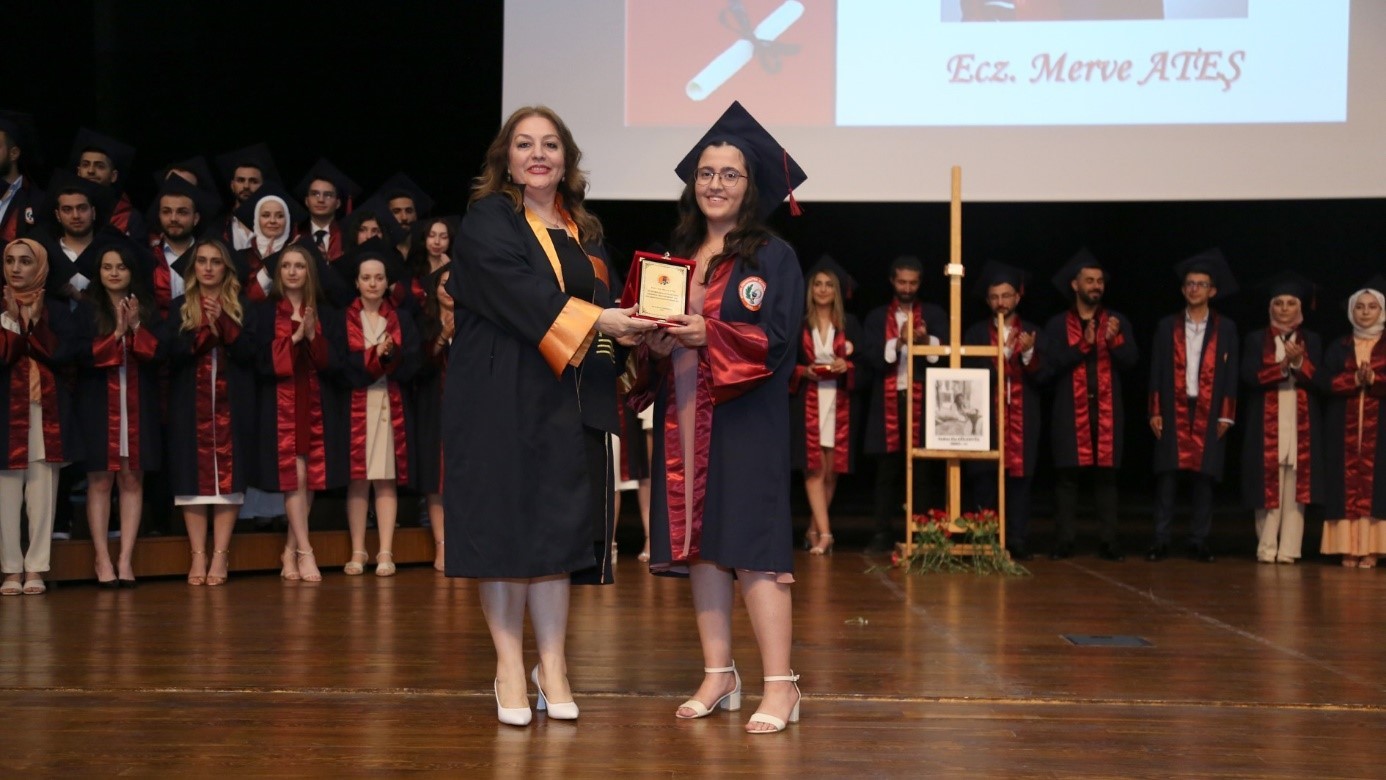 2023-2024 Eğitim Öğretim Yılı dönem birincisi Ecz. Burçin DÜŞKÜN, “Beş yıl önce hepimiz zorlu sınavlar sonucunda Eczacılık Fakültesi’ne gelmeye hak kazandık. Bugün ise hepimiz için bu uzun ve meşakkatli bir yolculuğun sonundayız. Ancak, bu yolculuk boyunca karşılaştığımız zorluklar ve başarılar, bizi daha da güçlü kıldı ve bu anın daha da değerli olmasını sağladı. Bugün, fakülte birincisi olmanın gururunu yaşıyorum. Ancak, bu başarı sadece bana ait değil. Arkamızda bizi destekleyen birçok kişi var. Ailelerimiz, arkadaşlarımız, öğretmenlerimiz ve akademik danışmanlarımız bize destek oldular ve bizi cesaretlendirdiler. Onlara minnettarız ve bu başarıyı onlarla paylaşıyoruz. Gelecekte, bu başarıyı sürdürmek ve eczacılık alanında daha da ileri gitmek için elimizden gelenin en iyisini yapacağız. Sağlık sistemimizin bir parçası olarak, toplumumuza hizmet etmek ve insanların yaşam kalitesini artırmak için çalışacağız.” şeklinde konuştu.
