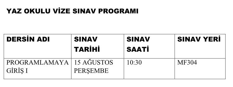 Programlamaya Giriş I dersinin ara sınavı 15/08/2024 tarihinde saat 10:30'da MF304 dersliğinde yapılacaktır.