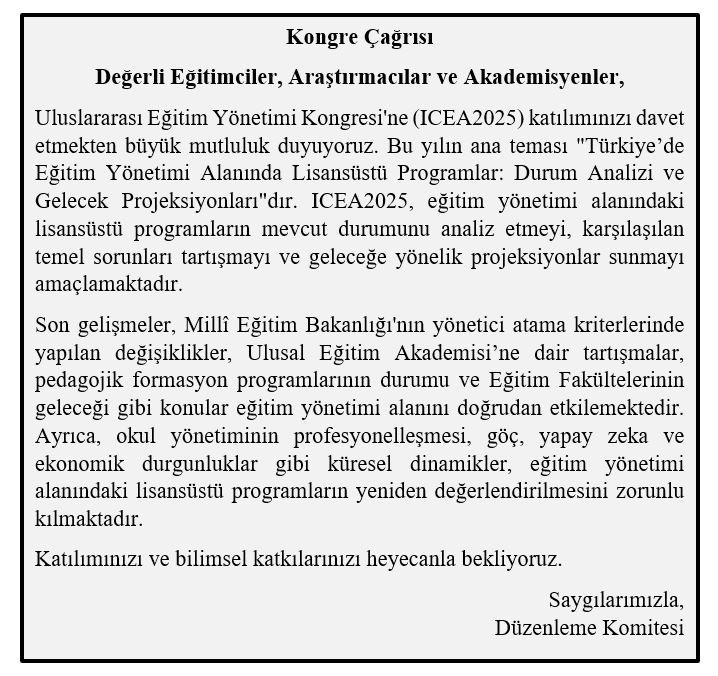 18. Uluslararası Eğitim Yönetimi Kongresi, Mersin Üniversitesi ile Eğitim Yöneticileri ve Eğitim Deneticileri Derneği işbirliğiyle 2-4 Mayıs 2025 tarihlerinde Mersin Üniversitesi’nde gerçekleştirilecektir.