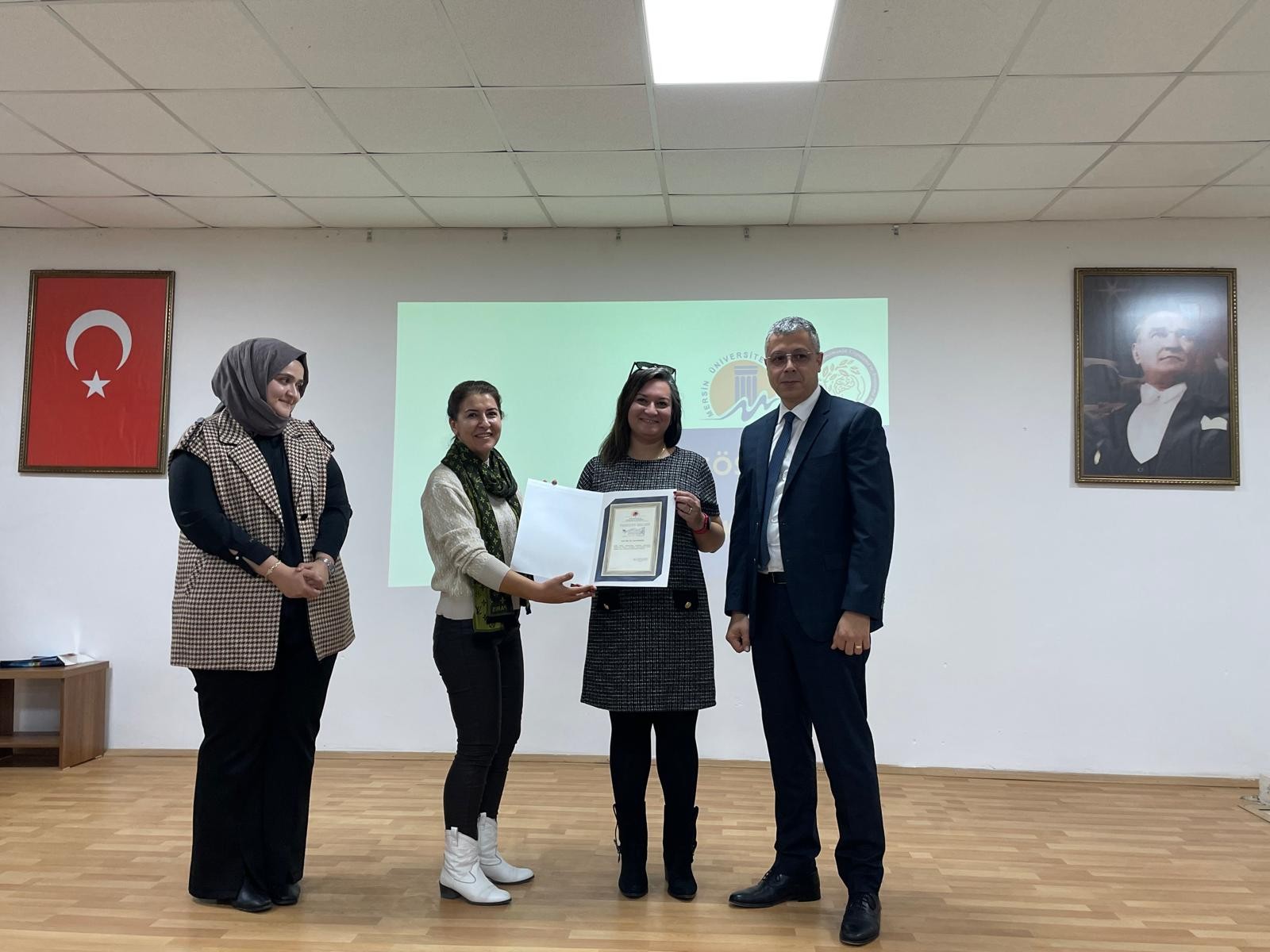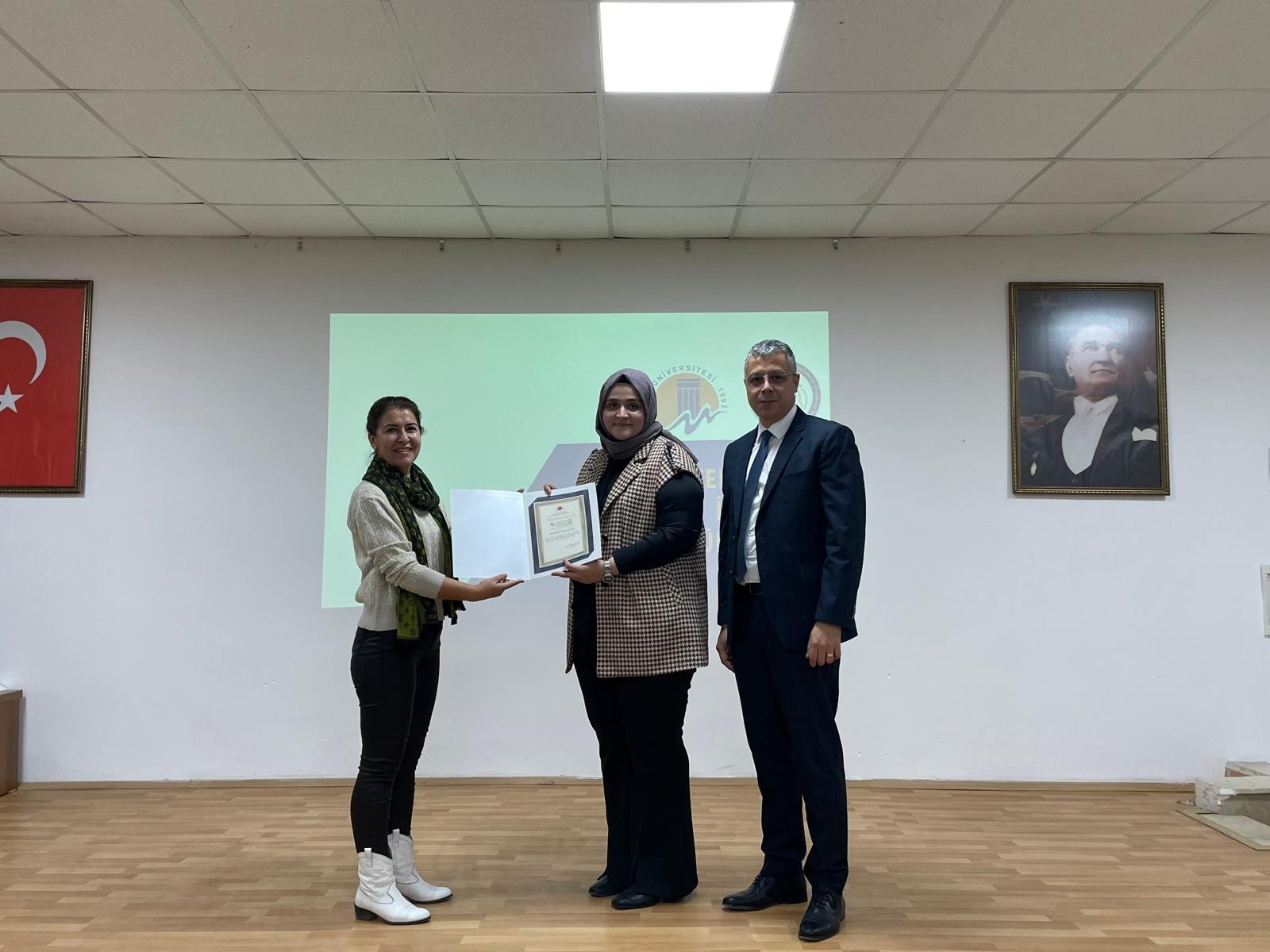 Etkinlik sonunda, Yüksekokul Müdürümüz Doç. Dr. Muhammet Saygın ve Müdür Yardımcısı Öğr. Gör. Fatma Yeşil tarafından katılımcılara teşekkür belgeleri takdim edildi.