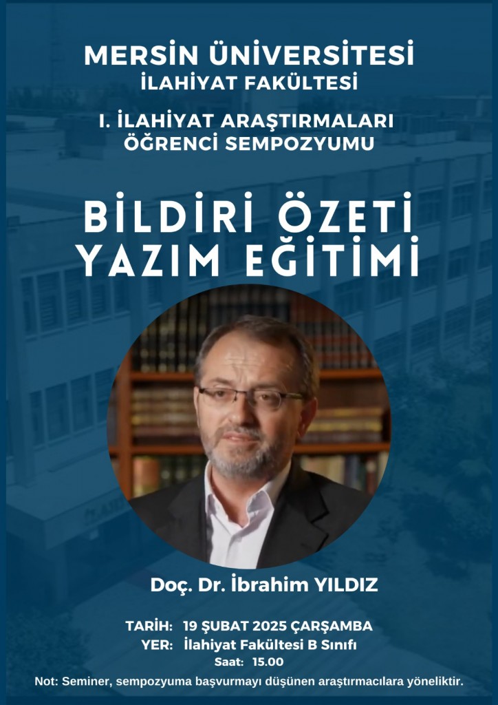 I. İlahiyat Araştırmaları Öğrenci Sempozyumu kapsamında sempozyuma başvurmayı düşünen araştırmacılara yönelik Doç. Dr. İbrahim Yıldız tarafından 19 Şubat 2025 Çarşamba günü saat 15.00'da İlahiyat Fakültesi B Dersliğinde "Bildiri Özeti Yazım Eğitimi" verilecektir.