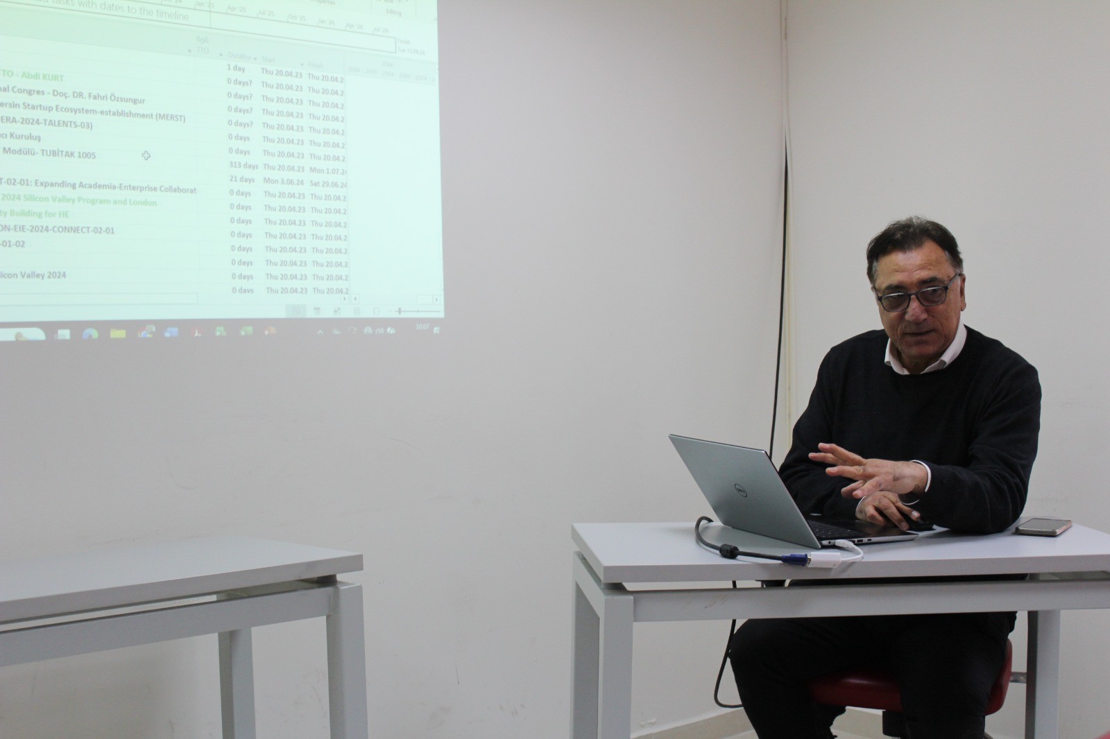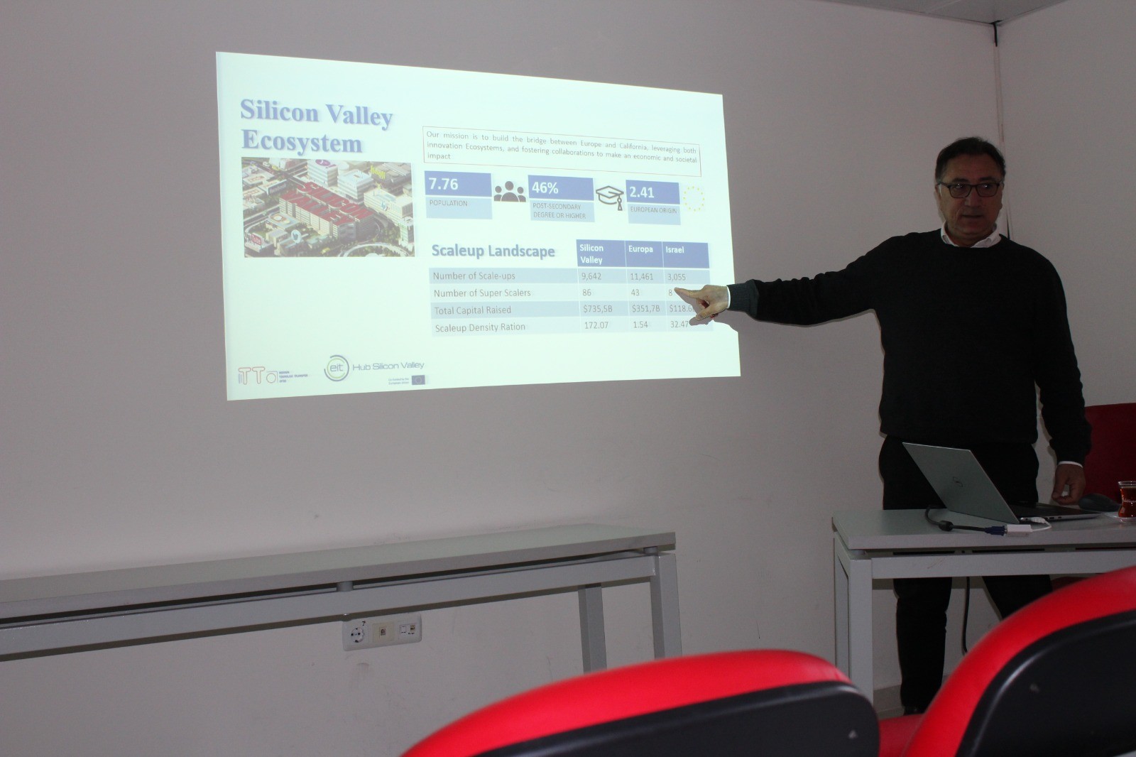 MEİTAM Seminer Salonu’ndaki toplantıda Mersin TTO Koordinatörü Abdi Kurt, katılımcılara 05-11 Ekim 2025 tarihinde Avrupa Birliği (EIT – Avrupa Birliği Inovasyon ve Teknoloji Kurumu) ülkeleri inovasyon liderlerinden oluşan özel bir ekiple katıldığı San Francisco'daki (ABD) Silikon Vadisi’ndeki programı ile ilgili deneyimlerini aktardı. “Silikon Deneyimler” temalı sunuda, Kurt dünyanın en baskın inovasyon-girişimcilik ekosisteminin üzerine oturduğu temel felsefe ile ilgili çıkarımları Prof. Dr. Nüzhet İkbal Türker ve ekibi ile paylaştı.