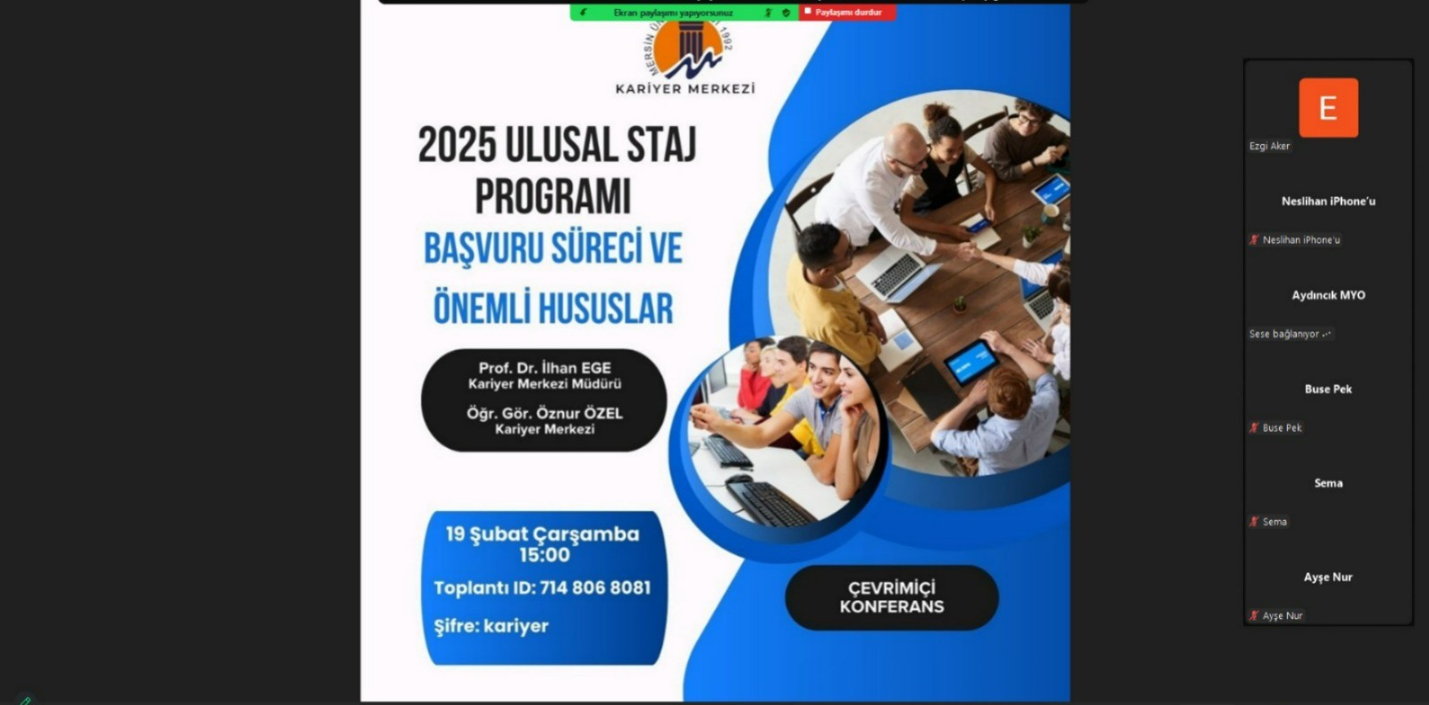 Sosyal Bilimler Meslek Yüksekokulu ve Kariyer Merkezi işbirliğinde, 2025 Ulusal Staj Programı başvuru süreci ve önemli bilgilere dair çevrimiçi bir seminer gerçekleştirildi. Seminere, öğrencilere staj başvurusu yaparken ihtiyaç duyacakları bilgileri sağlamak amacıyla Kariyer Merkezi ve Sosyal Bilimler MYO Müdürü Prof. Dr. İlhan Ege ile Öğr. Gör. Öznur Özel katıldı.