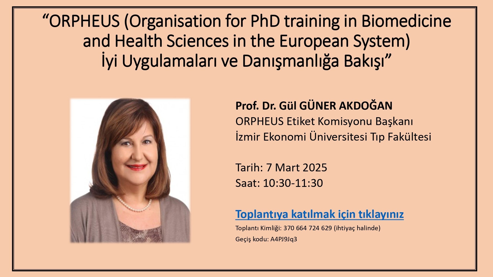 07 Mart 2025 Tarihinde Saat 10:30'da '' Orpheus ( Organisation For Phd Training İn Biomedicine And Health Sciences İn The European System) İyi Uygulamaları ve Danışmanlığa Bakışı '' Adlı Çevrimiçi Seminer Gerçekleştirmiştir.