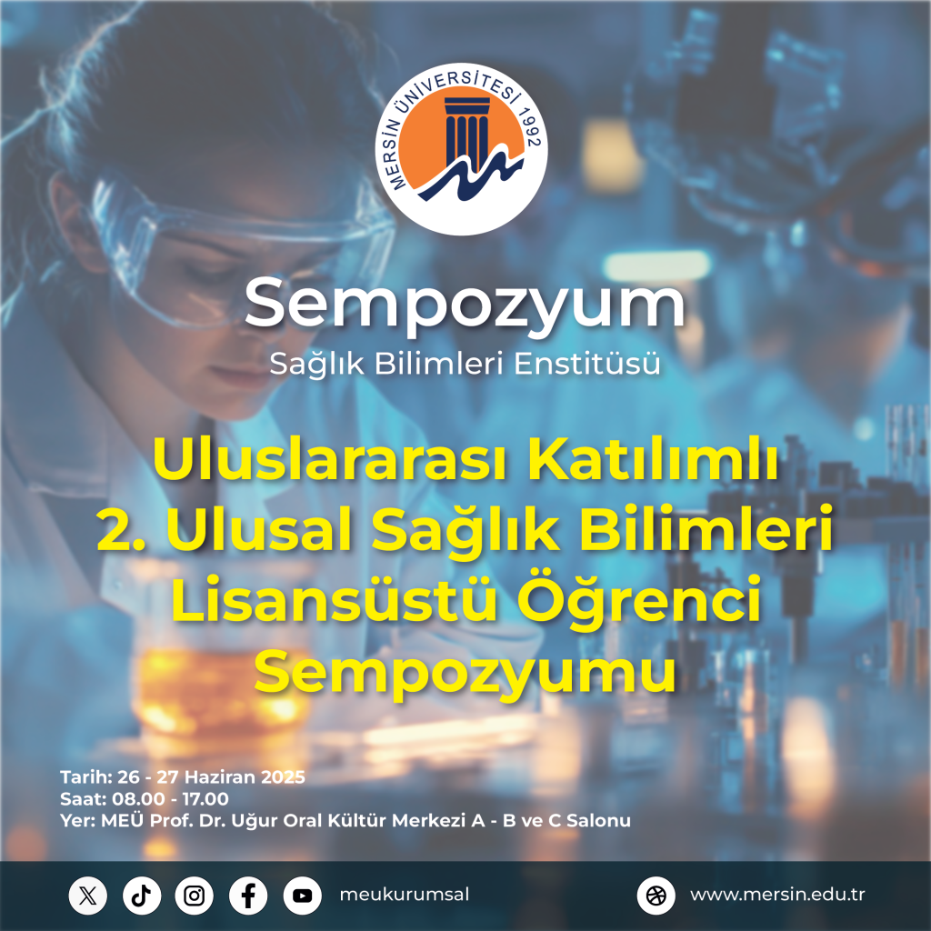 Uluslararası Katılımlı 2. Ulusal Sağlık Bilimleri Lisansüstü Öğrenci Sempozyumu 26-27 Haziran 2025 tarihinde MEÜ Prof. Dr. Uğur Oral Kültür Merkezi A-B-C Salonunda gerçekleştirilecektir. Detaylı bilgi ve başvuru için https://sagbilsempozyum2025.mersin.edu.tr/ adresini ziyaret edebilirsiniz.