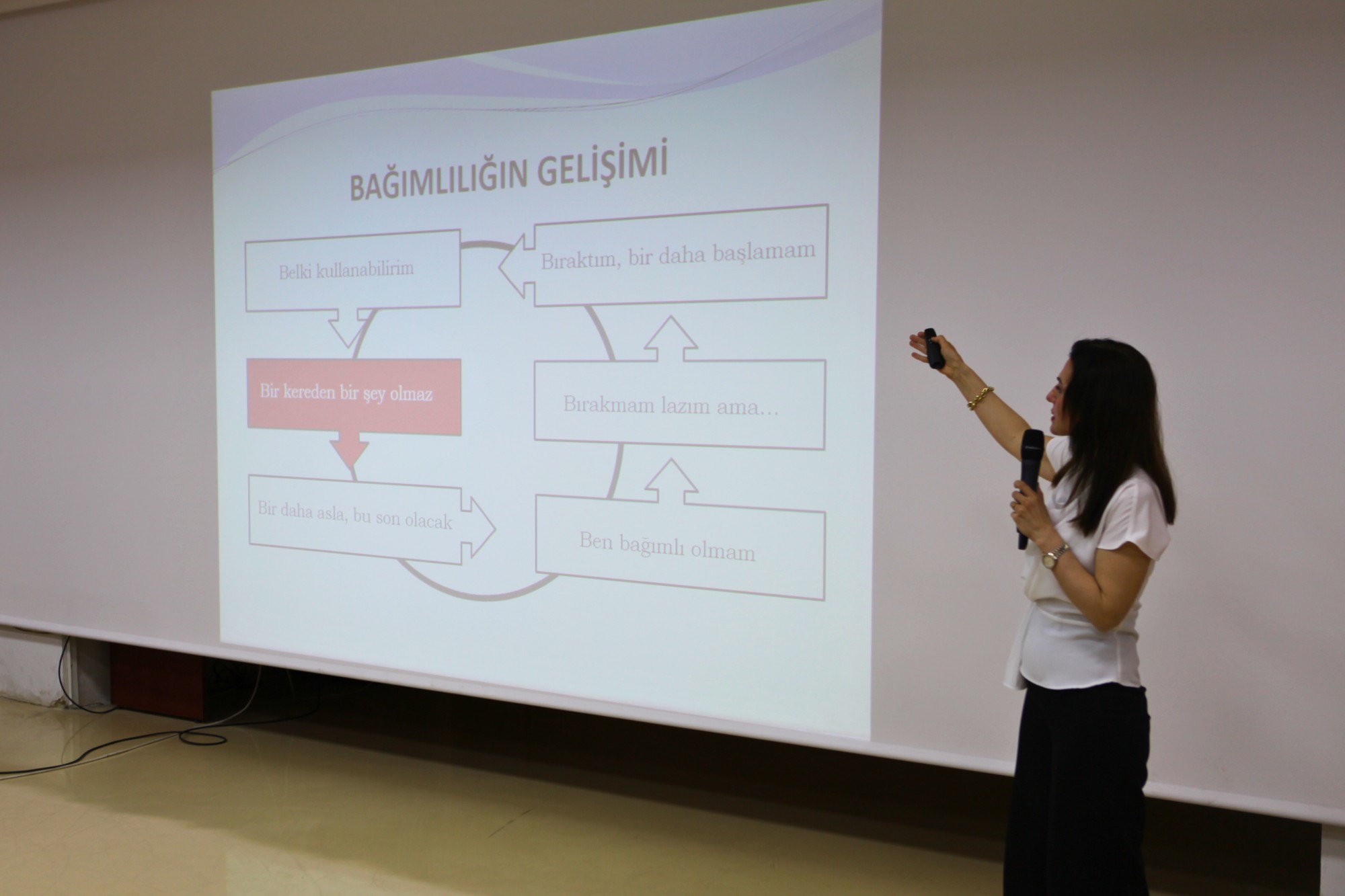 Etkinliğe, Mersin Üniversitesi İletişim Fakültesi Dekanı Prof. Dr. Aslıhan Ardıç Çobaner, Radyo, Televizyon ve Sinema Bölüm Başkanı Doç. Dr. Filiz Bilgin Ülken, Halkla İlişkiler ve Reklamcılık Bölüm Başkanı Doç. Dr. Duygu Özsoy Taylan’ın yanı sıra çok sayıda akademisyen ve öğrenci katıldı. Sunum sonrası öğrenciler, bağımlılık süreci ve tedavi yöntemlerine dair sorular yönelterek etkinliğe aktif katılım gösterdi.