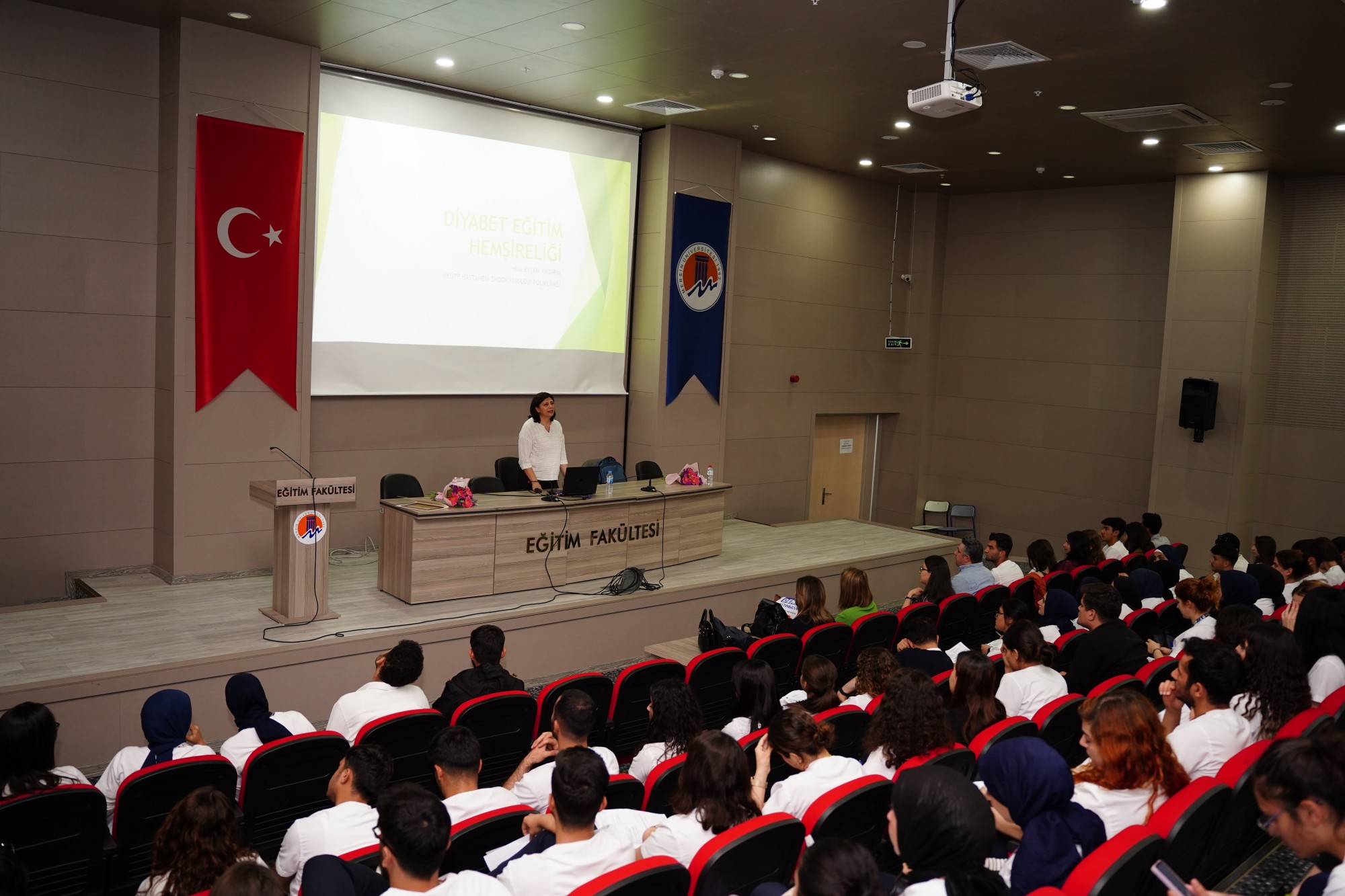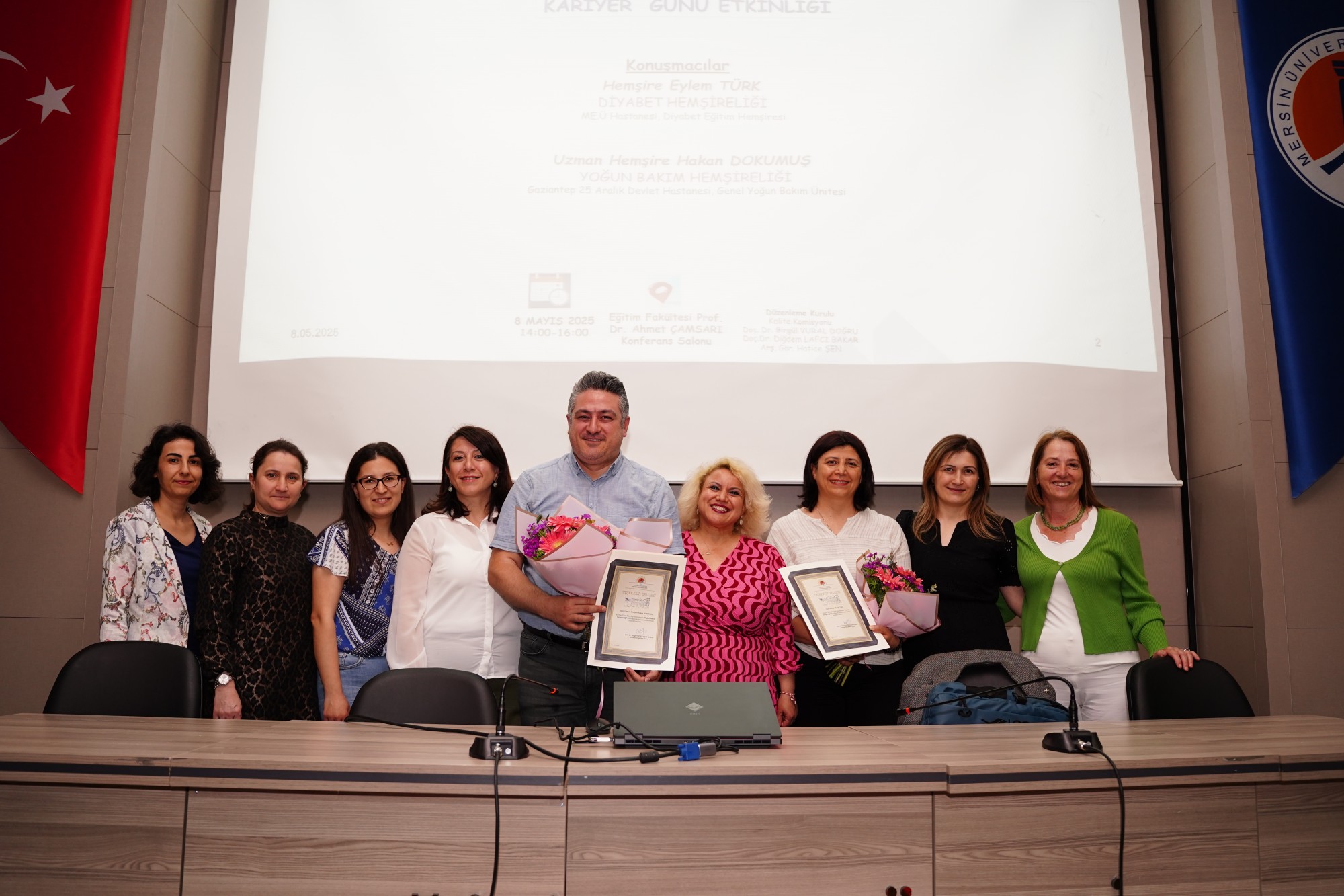 Mersin Üniversitesi Hemşirelik Fakültesi Birim Kalite Geliştirme Komisyonu tarafından 8 Mayıs 2025 tarihinde Prof. Dr. Ahmet ÇAMSARI konferans salonunda "Kariyer Günü Etkinliği" kapsamında düzenlenen eğitim programında, Hemşirelik Bölümü son sınıf öğrencilerine yönelik "Diyabet Hemşireliği ve Yoğun Bakım Hemşireliği" konulu bir eğitim gerçekleştirildi. Etkinlik, Birim Kalite Geliştirme Komisyonu üyeleri Doç. Dr. Diğdem Lafcı Bakar, Doç. Dr. Birgül Vural Doğru ve Arş. Gör. Hatice Şen’in organizasyonuyla planlandı. Programa Hemşirelik Fakültesi Dekanı Prof. Dr. Duygu Vefikuluçay Yılmaz, Dekan Yardımcıları Doç. Dr. Sümbüle Köksoy Vayısoğlu ve Dr. Öğr. Üyesi Tuba Güner Emül de katılım sağladı.