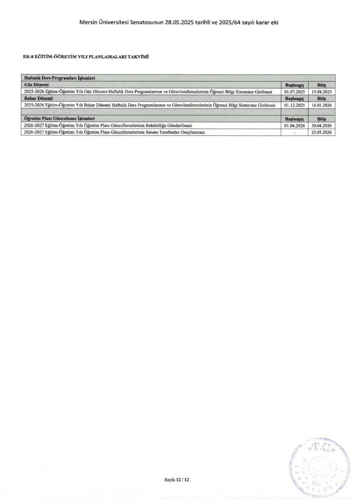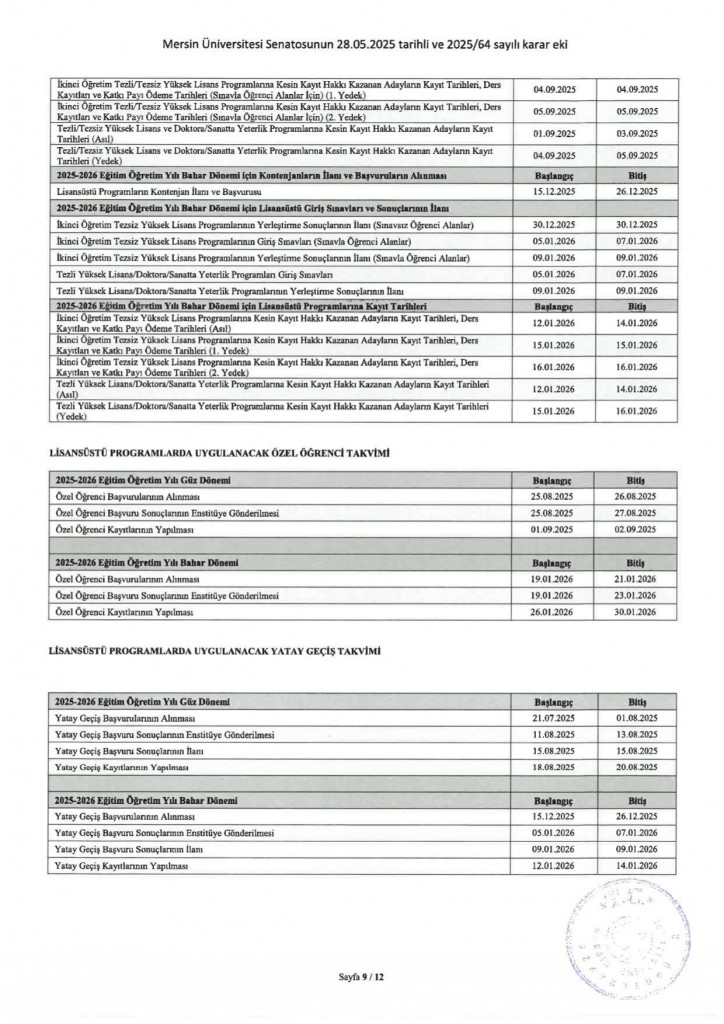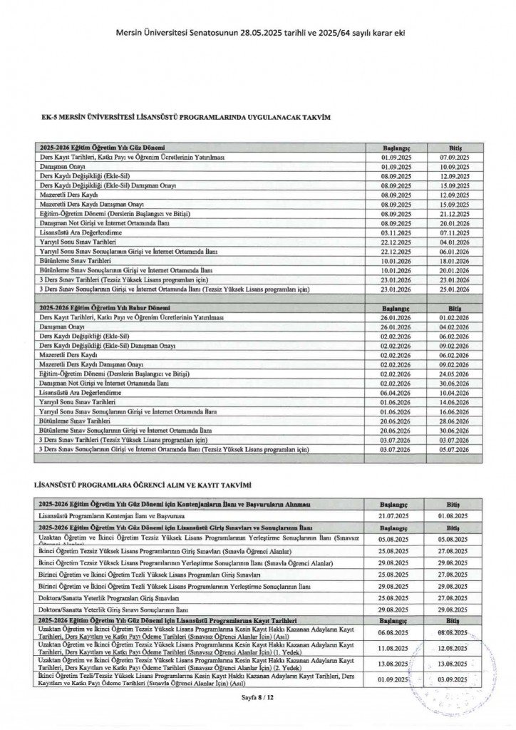 2025-2026 Eğitim Öğretim Yılı Akademik Takvimi