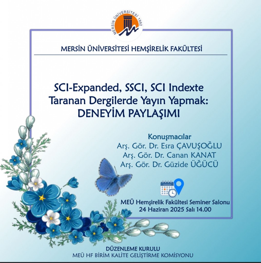 Fakültemiz Birim Kalite Geliştirme Komisyonu tarafından düzenlenen ''SCI-Expanded, SSCI, SCI Indexte Taranan Dergilerde Yayın Yapmak: Deneyim Paylaşımı’’ başlıklı etkinliğimiz 24.06.2025 Salı saat 14.00’de Hemşirelik Fakültesi Seminer Salonunda gerçekleştirilmiştir. Fakültemiz öğretim üyelerinden Arş. Gör. Dr. Esra ÇAVUŞOĞLU, Arş. Gör. Dr. Canan KANAT ve Arş. Gör. Dr. Güzide ÜĞÜCÜ yayın yapma süreci ve deneyimlerine yönelik sunumlarını gerçekleştirmiştir.