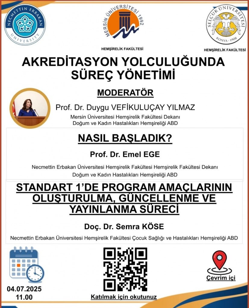 Hemşirelik Fakültemizin akreditasyon çalışmaları kapsamında, Standart 1 Çalışma Grubu ile Selçuk Üniversitesi Hemşirelik Fakültesi iş birliğinde düzenlenen “Akreditasyon Yolculuğunda Süreç Yönetimi” başlıklı eğitim programı, 4 Temmuz 2025 Cuma günü saat 11.00’de çevrimiçi ortamda başarıyla gerçekleştirildi.