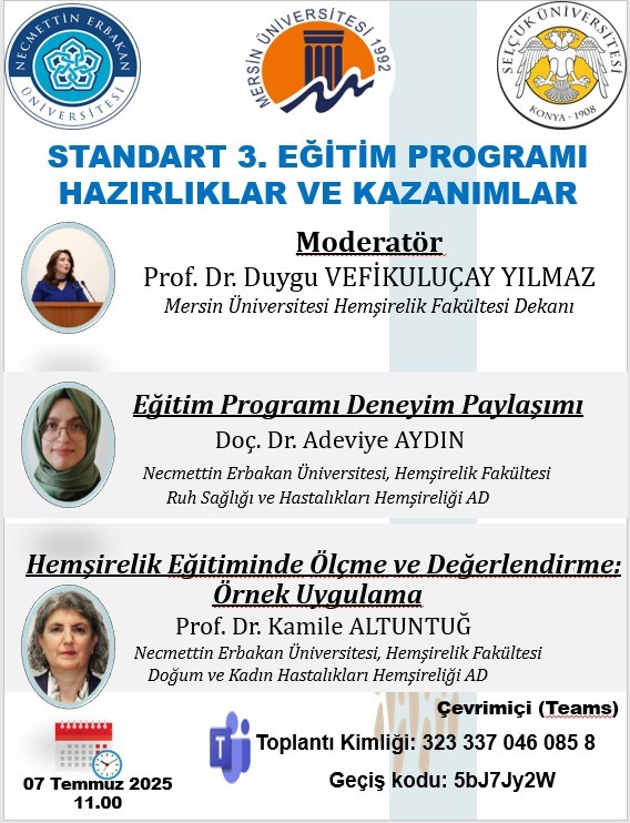 Hemşirelik Fakültemizin akreditasyon çalışmaları kapsamında, Standart 3 Çalışma Grubu ile Selçuk Üniversitesi Hemşirelik Fakültesi iş birliğinde düzenlenen “Standart 3. Eğitim Programı Hazırlıklar ve Kazanımlar” başlıklı eğitim, 7 Temmuz 2025 tarihinde saat 11.00’de çevrim içi ortamda başarıyla gerçekleştirilmiştir.
