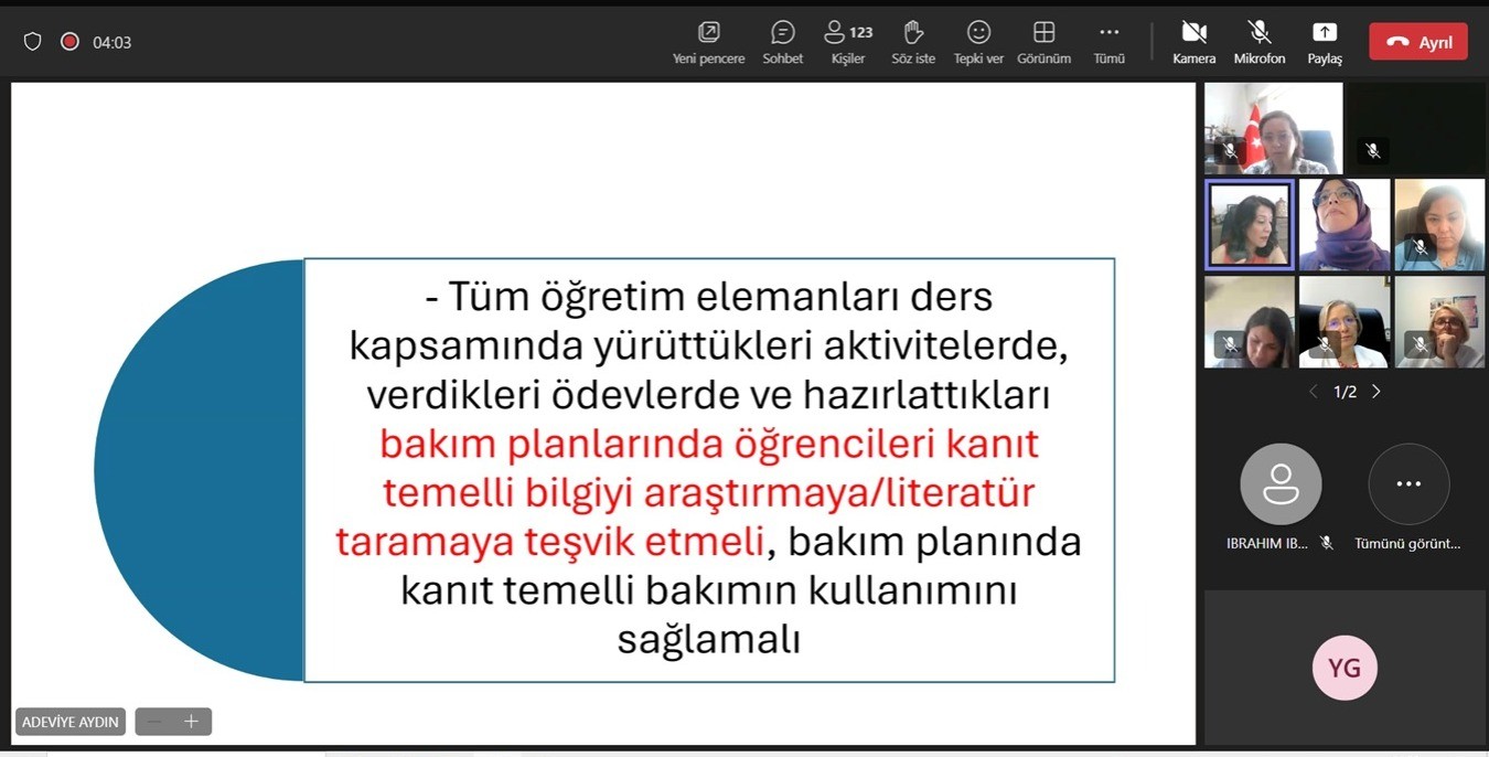 Fakültemiz Dekanı Prof. Dr. Duygu VEFİKULUÇAY YILMAZ’ın moderatörlüğünde yürütülen programda, Necmettin Erbakan Üniversitesi Hemşirelik Fakültesi Öğretim Üyesi Doç. Dr. Adeviye AYDIN tarafından; müfredat yapısı, ders içerikleri, öğretim yöntemleri ile laboratuvar ve klinik uygulamalara yönelik yürütülen çalışmalar hakkında katılımcılara ayrıntılı bilgi verilmiştir.