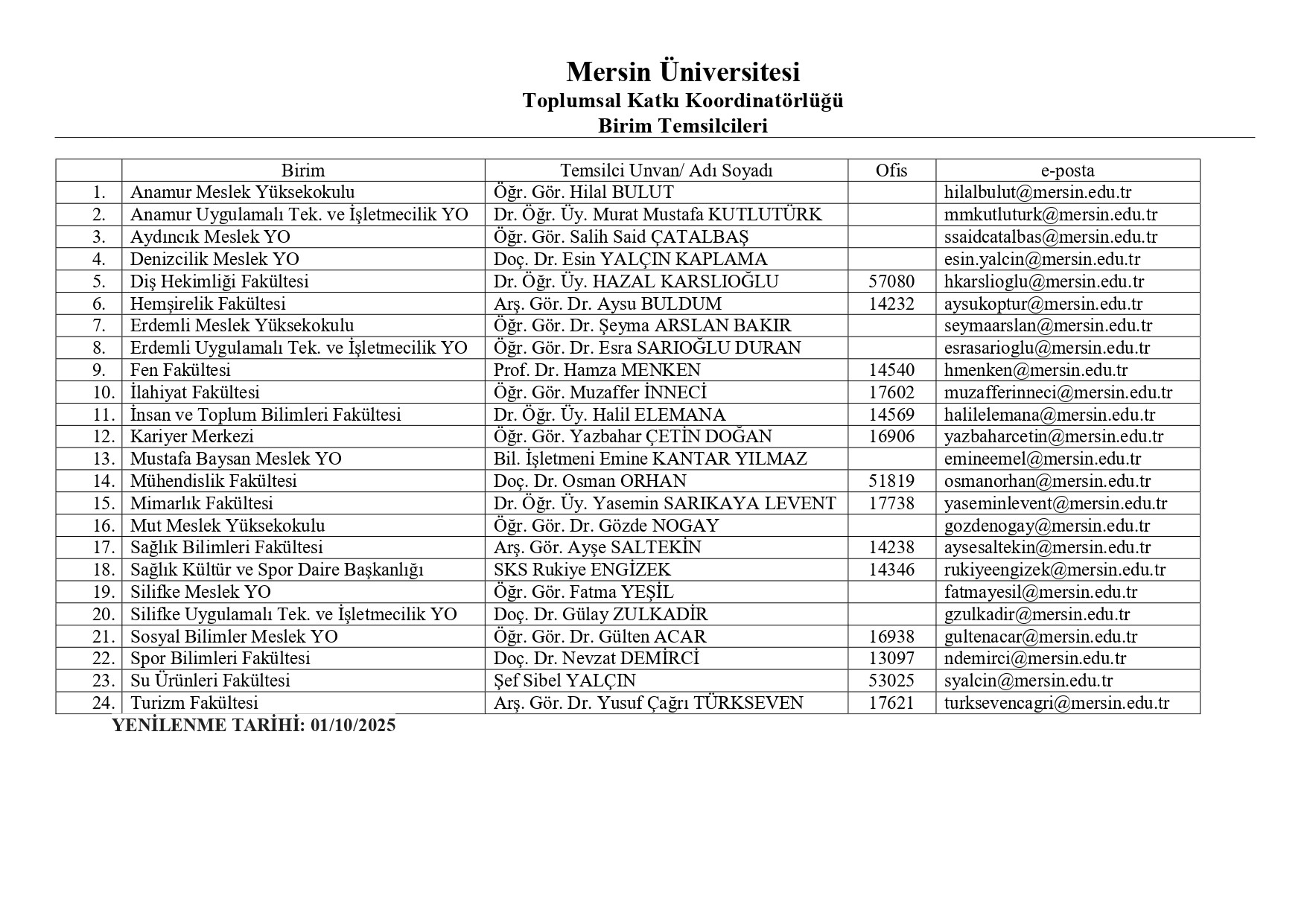 Toplumsal Katkı Koordinatörlüğü Birim Temsilcileri Listesi