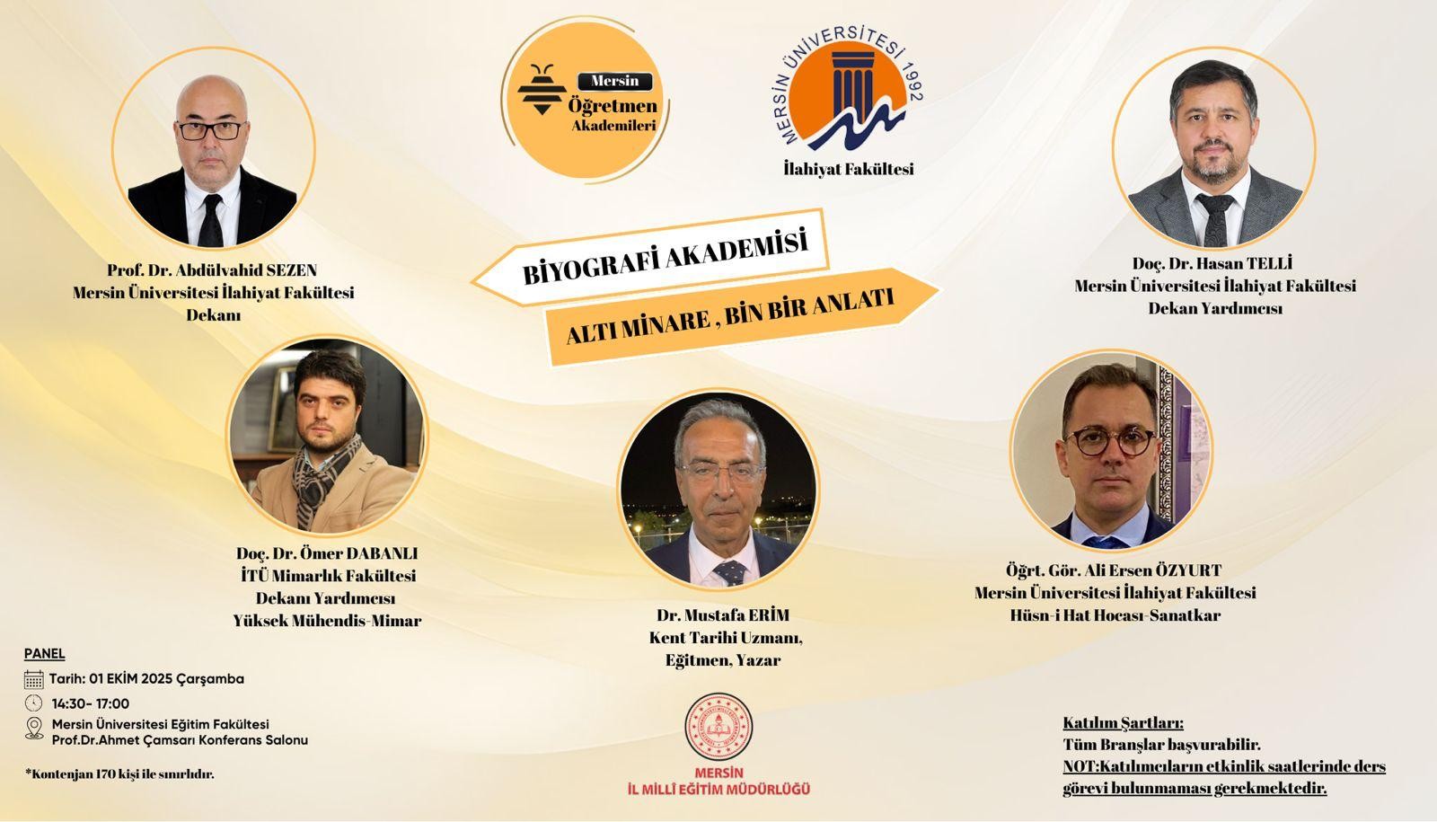 Mersin İl Milli Eğitim Müdürlüğü ve Mersin Üniversitesi İlahiyat Fakültemizin birlikte düzenlediği 01.10.2025 tarihi 14:30-17:00 saatleri arasında Prof. Dr. Ahmet Çamsarı konferans salonunda gerçekleştirilen "Altı Minare Binbir Anlatı" konulu panelde dekanımız Prof. Dr. Abdulvahid Sezen ve dekan yardımcımız Doç. Dr. Hasan Telli tebliğ sundular.