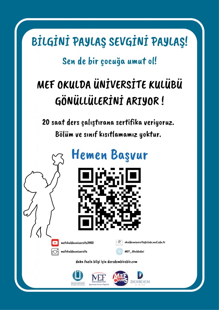 MEF Okulda Üniversite Kulübü tarafından 2014 yılından bu yana "DERSDEM BİREBİR DERS ÇALIŞTIRMA PROJESİ" kapsamında ihtiyaç sahibi öğrencilere destek verilmektedir. Projeye katılmak isteyen fakültemiz öğrencileri için duyuru metni aşağıda sunulmuştur.
